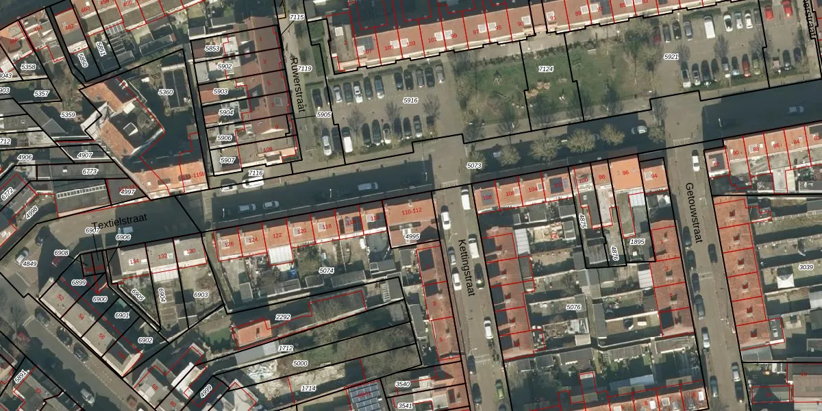 Textielstraat 110 is gelegen op kadastraal perceel TBG01O4995. Deze kadastrale aanduiding is uniek en wordt gebruikt door het Kadaster om eigendomsrechten en andere zakelijke rechten vast te leggen. Het perceel maakt onderdeel uit van de kadastrale gemeente Tilburg.