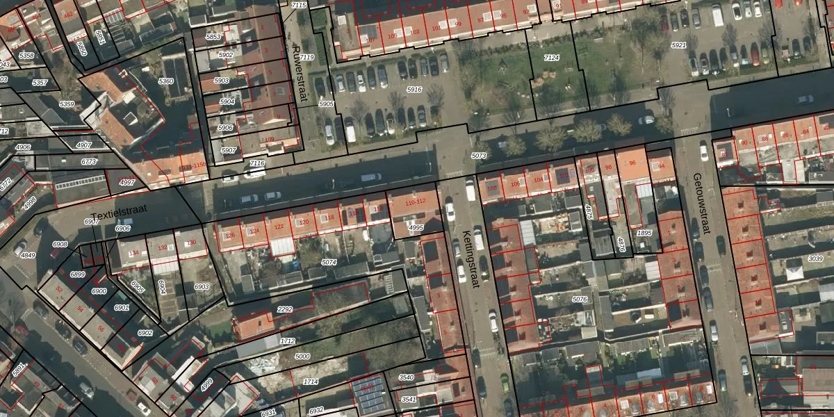 Textielstraat 112 is gelegen op kadastraal perceel TBG01O4995. Deze kadastrale aanduiding is uniek en wordt gebruikt door het Kadaster om eigendomsrechten en andere zakelijke rechten vast te leggen. Het perceel maakt onderdeel uit van de kadastrale gemeente Tilburg.