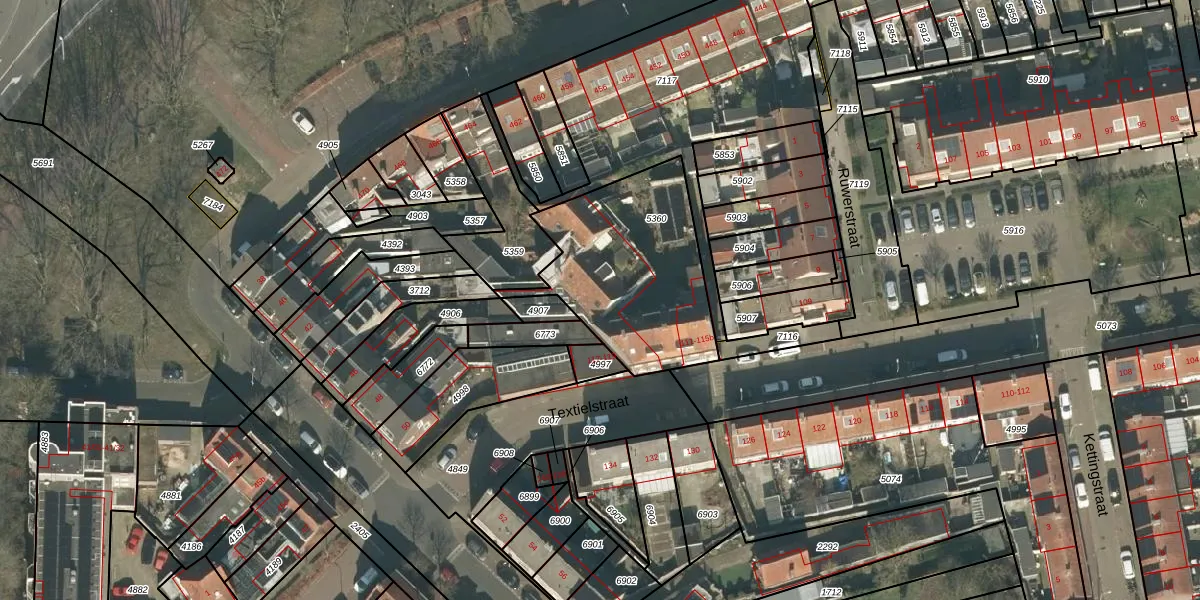 Het perceel waarop Textielstraat 113-f staat heeft een oppervlakte van 730 m². Dit is een groot perceel. De perceeloppervlakte wordt geregistreerd door het Kadaster. Gedetailleerde informatie over de maten van dit perceel kunt u vinden in het rapport Kadastrale kaart met maatvoering van Textielstraat 113-f.