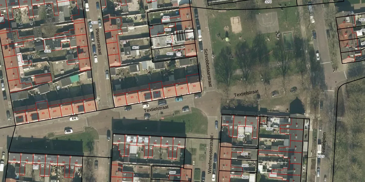 Het perceel waarop Textielstraat 45 staat heeft een oppervlakte van 2585 m². Dit is een zeer groot perceel. De perceeloppervlakte wordt geregistreerd door het Kadaster. Gedetailleerde informatie over de maten van dit perceel kunt u vinden in het rapport Kadastrale kaart met maatvoering van Textielstraat 45.
