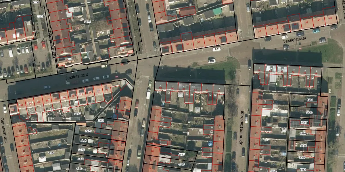 Het perceel waarop Textielstraat 66 staat heeft een oppervlakte van 4185 m². Dit is een zeer groot perceel. De perceeloppervlakte wordt geregistreerd door het Kadaster. Gedetailleerde informatie over de maten van dit perceel kunt u vinden in het rapport Kadastrale kaart met maatvoering van Textielstraat 66.