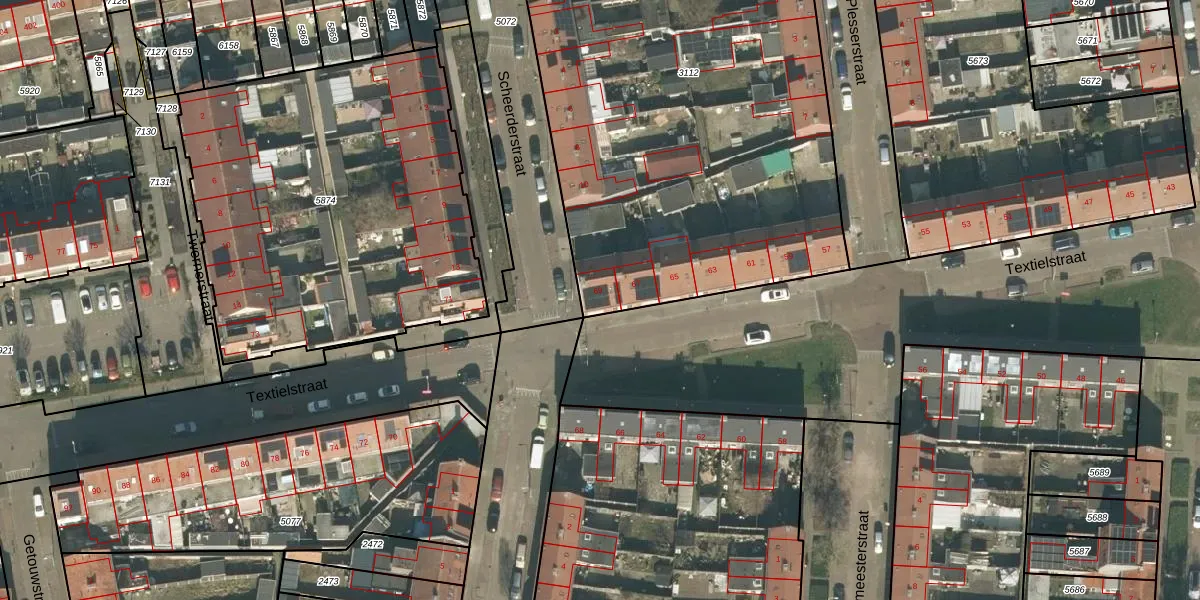Het perceel waarop Textielstraat 69 staat heeft een oppervlakte van 3250 m². Dit is een zeer groot perceel. De perceeloppervlakte wordt geregistreerd door het Kadaster. Gedetailleerde informatie over de maten van dit perceel kunt u vinden in het rapport Kadastrale kaart met maatvoering van Textielstraat 69.