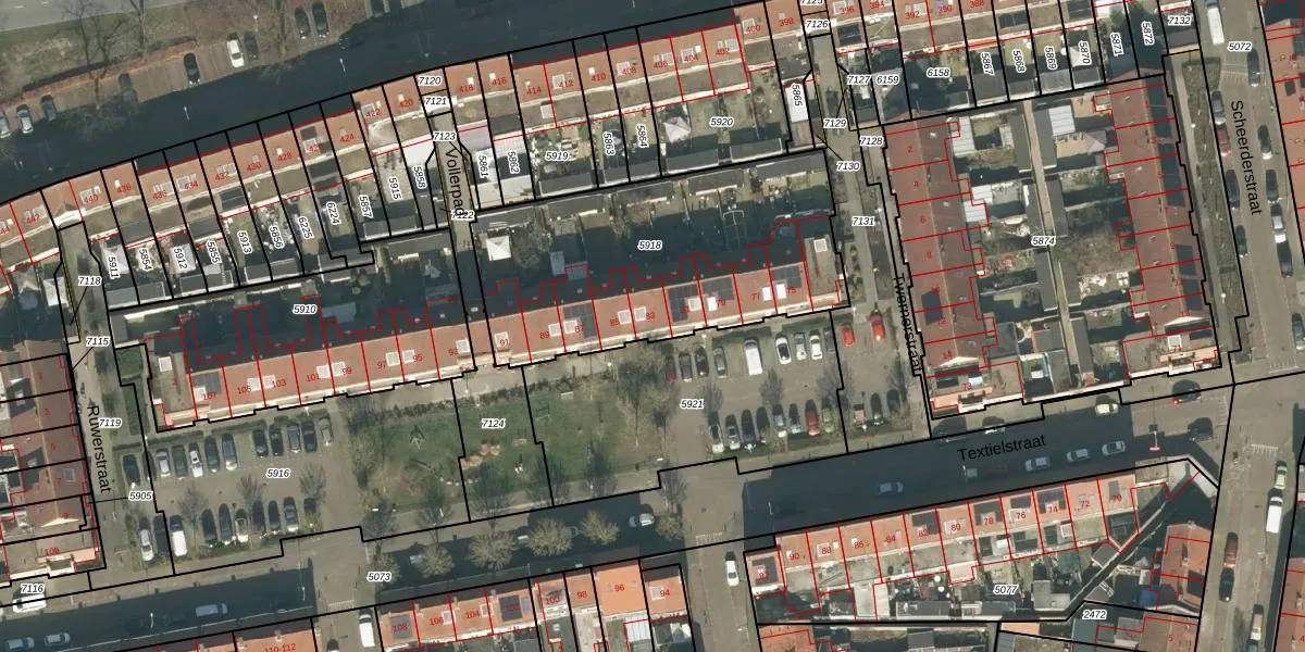 Het perceel waarop Textielstraat 83 staat heeft een oppervlakte van 1343 m². Dit is een zeer groot perceel. De perceeloppervlakte wordt geregistreerd door het Kadaster. Gedetailleerde informatie over de maten van dit perceel kunt u vinden in het rapport Kadastrale kaart met maatvoering van Textielstraat 83.