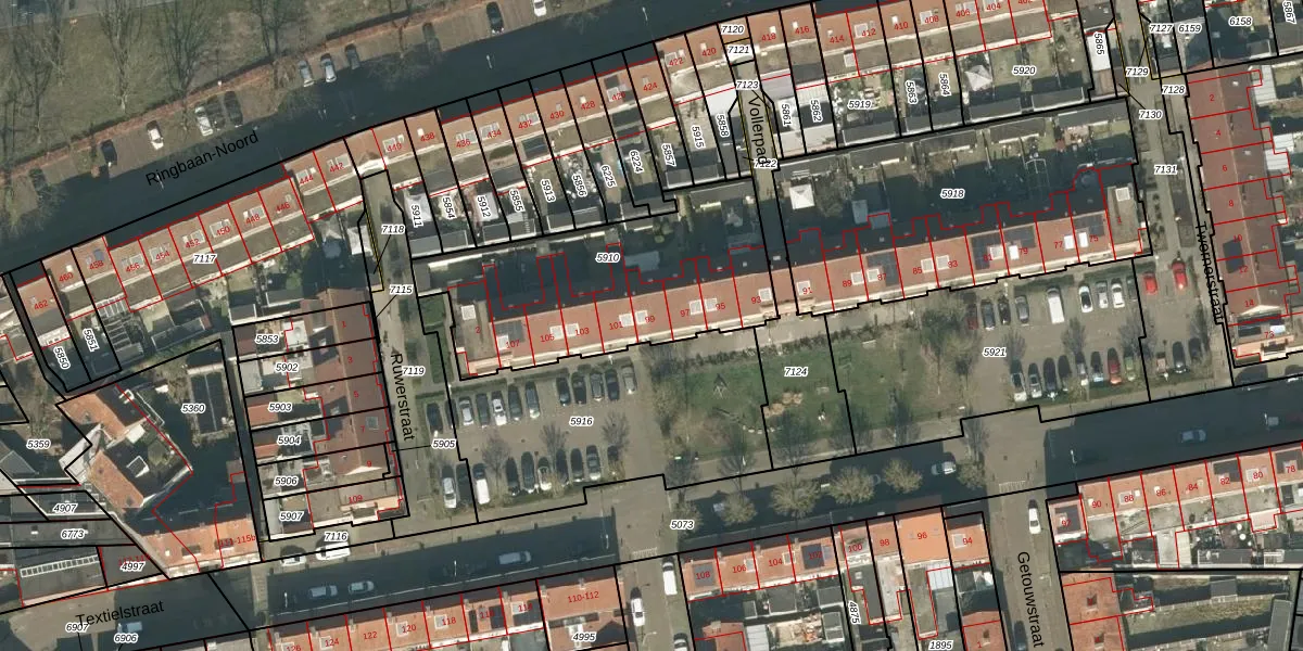 Textielstraat 99 is gelegen op kadastraal perceel TBG01O5910. Deze kadastrale aanduiding is uniek en wordt gebruikt door het Kadaster om eigendomsrechten en andere zakelijke rechten vast te leggen. Het perceel maakt onderdeel uit van de kadastrale gemeente Tilburg.