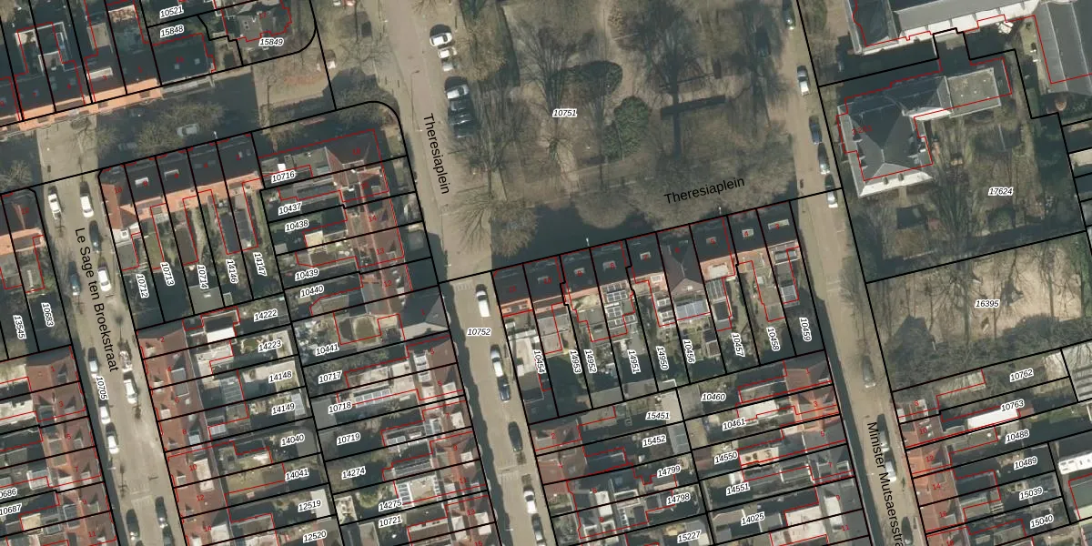 Het perceel waarop Theresiaplein 10 staat heeft een oppervlakte van 176 m². Dit is een middelgroot perceel. De perceeloppervlakte wordt geregistreerd door het Kadaster. Gedetailleerde informatie over de maten van dit perceel kunt u vinden in het rapport Kadastrale kaart met maatvoering van Theresiaplein 10.