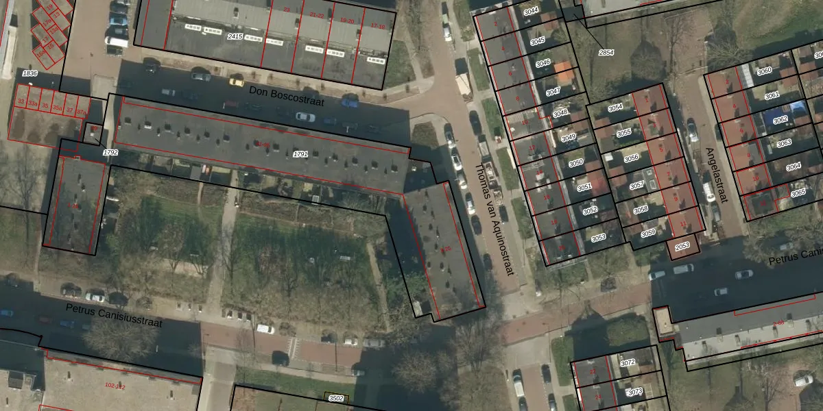 Het perceel waarop Thomas van Aquinostraat 15 staat heeft een oppervlakte van 2155 m². Dit is een zeer groot perceel. De perceeloppervlakte wordt geregistreerd door het Kadaster. Gedetailleerde informatie over de maten van dit perceel kunt u vinden in het rapport Kadastrale kaart met maatvoering van Thomas van Aquinostraat 15.