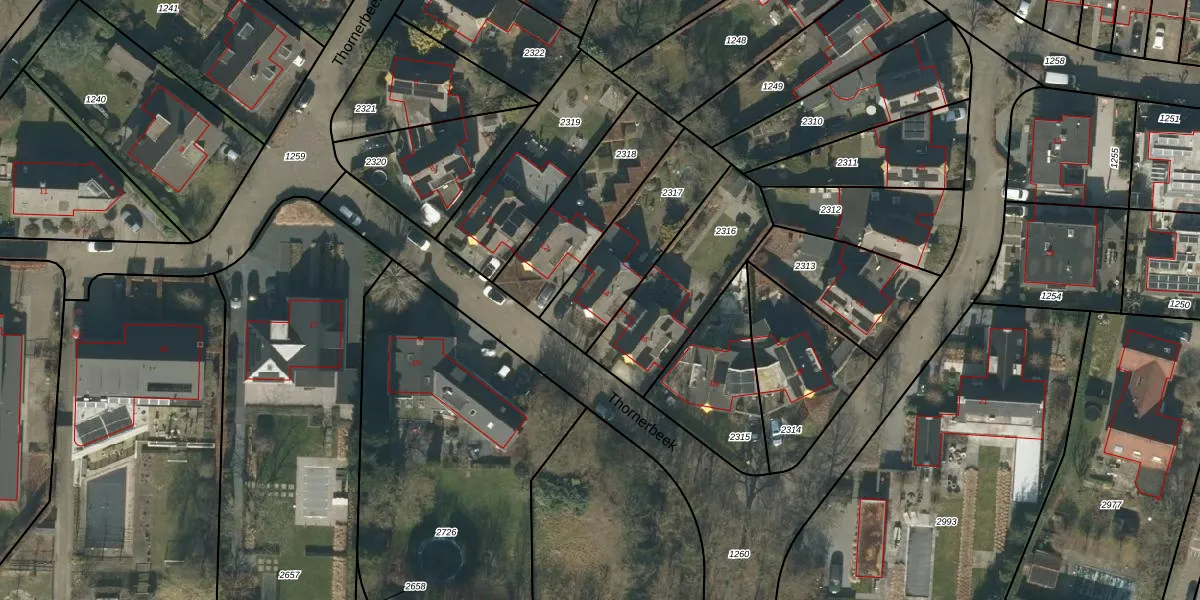 Het perceel waarop Thornerbeek 14 staat heeft een oppervlakte van 394 m². Dit is een groot perceel. De perceeloppervlakte wordt geregistreerd door het Kadaster. Gedetailleerde informatie over de maten van dit perceel kunt u vinden in het rapport Kadastrale kaart met maatvoering van Thornerbeek 14.