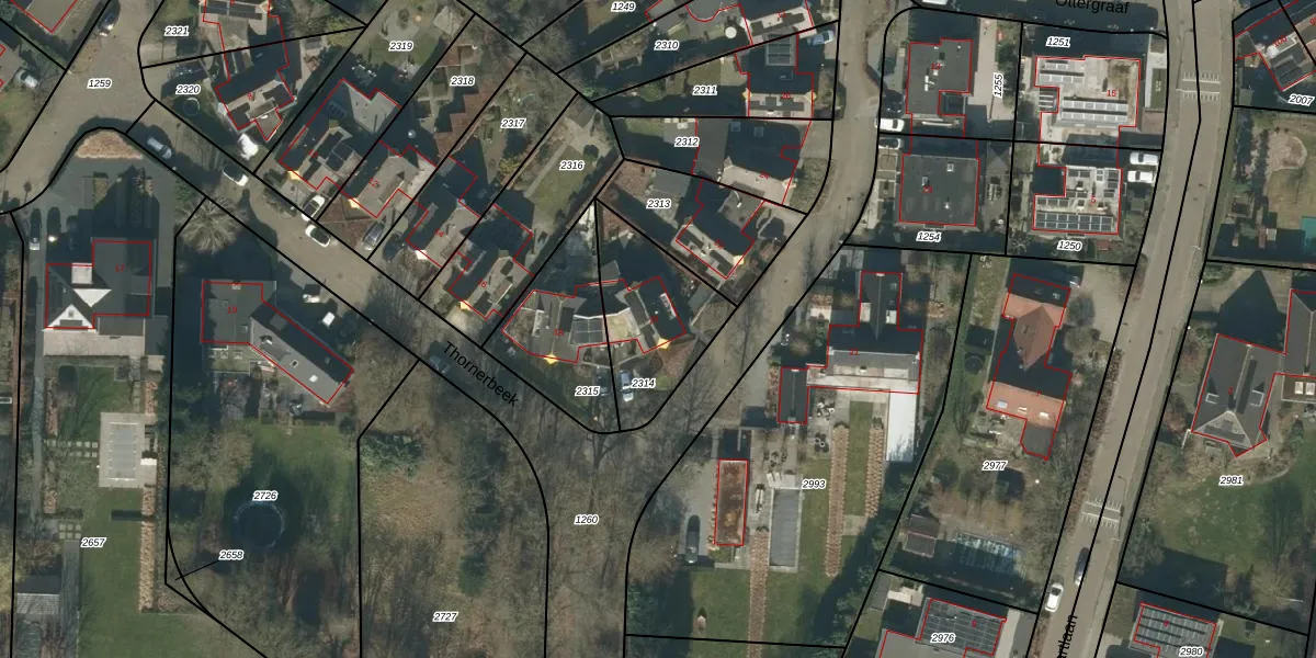 Thornerbeek 20 is gelegen op kadastraal perceel TBG01AA2314. Deze kadastrale aanduiding is uniek en wordt gebruikt door het Kadaster om eigendomsrechten en andere zakelijke rechten vast te leggen. Het perceel maakt onderdeel uit van de kadastrale gemeente Tilburg.