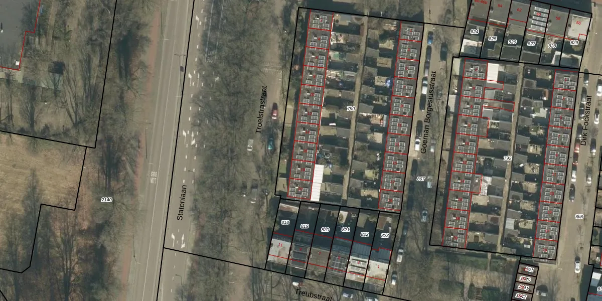 Het perceel waarop Troelstrastraat 16 staat heeft een oppervlakte van 2680 m². Dit is een zeer groot perceel. De perceeloppervlakte wordt geregistreerd door het Kadaster. Gedetailleerde informatie over de maten van dit perceel kunt u vinden in het rapport Kadastrale kaart met maatvoering van Troelstrastraat 16.