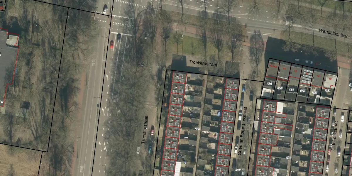 Het perceel waarop Troelstrastraat 4 staat heeft een oppervlakte van 2680 m². Dit is een zeer groot perceel. De perceeloppervlakte wordt geregistreerd door het Kadaster. Gedetailleerde informatie over de maten van dit perceel kunt u vinden in het rapport Kadastrale kaart met maatvoering van Troelstrastraat 4.