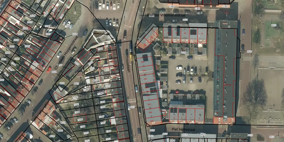 Het perceel waarop Trouwlaan 154 staat heeft een oppervlakte van 4537 m². Dit is een zeer groot perceel. De perceeloppervlakte wordt geregistreerd door het Kadaster. Gedetailleerde informatie over de maten van dit perceel kunt u vinden in het rapport Kadastrale kaart met maatvoering van Trouwlaan 154.