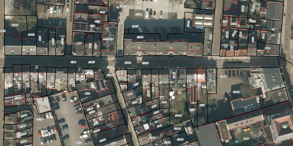 Tuinstraat 54 is gelegen op kadastraal perceel TBG01M8981. Deze kadastrale aanduiding is uniek en wordt gebruikt door het Kadaster om eigendomsrechten en andere zakelijke rechten vast te leggen. Het perceel maakt onderdeel uit van de kadastrale gemeente Tilburg.