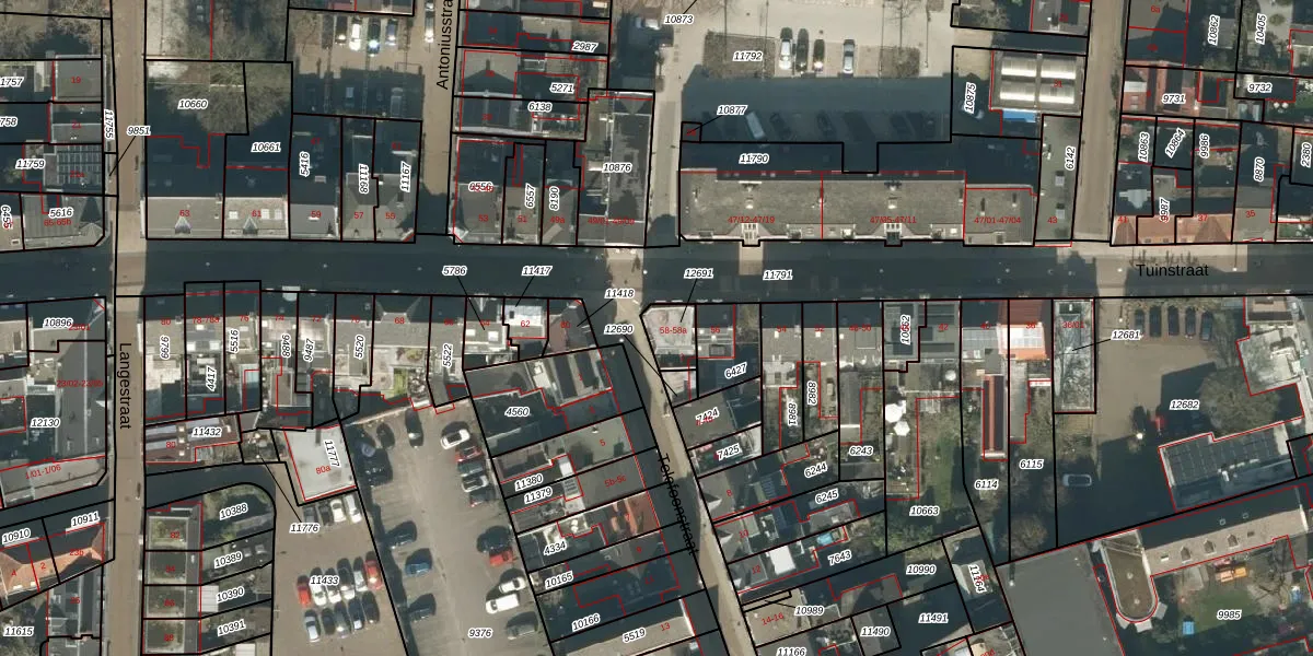 Tuinstraat 58 is gelegen op kadastraal perceel TBG01M12691. Deze kadastrale aanduiding is uniek en wordt gebruikt door het Kadaster om eigendomsrechten en andere zakelijke rechten vast te leggen. Het perceel maakt onderdeel uit van de kadastrale gemeente Tilburg.