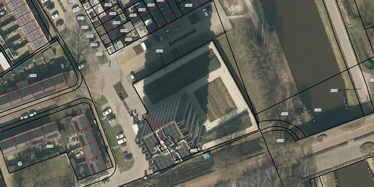 Het perceel waarop Twentestraat 150 staat heeft een oppervlakte van 2530 m². Dit is een zeer groot perceel. De perceeloppervlakte wordt geregistreerd door het Kadaster. Gedetailleerde informatie over de maten van dit perceel kunt u vinden in het rapport Kadastrale kaart met maatvoering van Twentestraat 150.