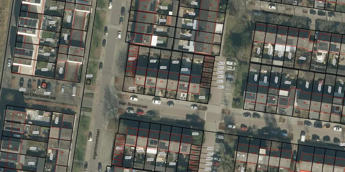 Het perceel waarop Van Breestraat 87 staat heeft een oppervlakte van 175 m². Dit is een middelgroot perceel. De perceeloppervlakte wordt geregistreerd door het Kadaster. Gedetailleerde informatie over de maten van dit perceel kunt u vinden in het rapport Kadastrale kaart met maatvoering van Van Breestraat 87.