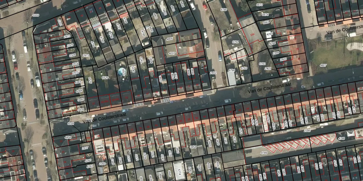 Het perceel waarop Van de Coulsterstraat 39 staat heeft een oppervlakte van 85 m². Dit is een klein perceel. De perceeloppervlakte wordt geregistreerd door het Kadaster. Gedetailleerde informatie over de maten van dit perceel kunt u vinden in het rapport Kadastrale kaart met maatvoering van Van de Coulsterstraat 39.