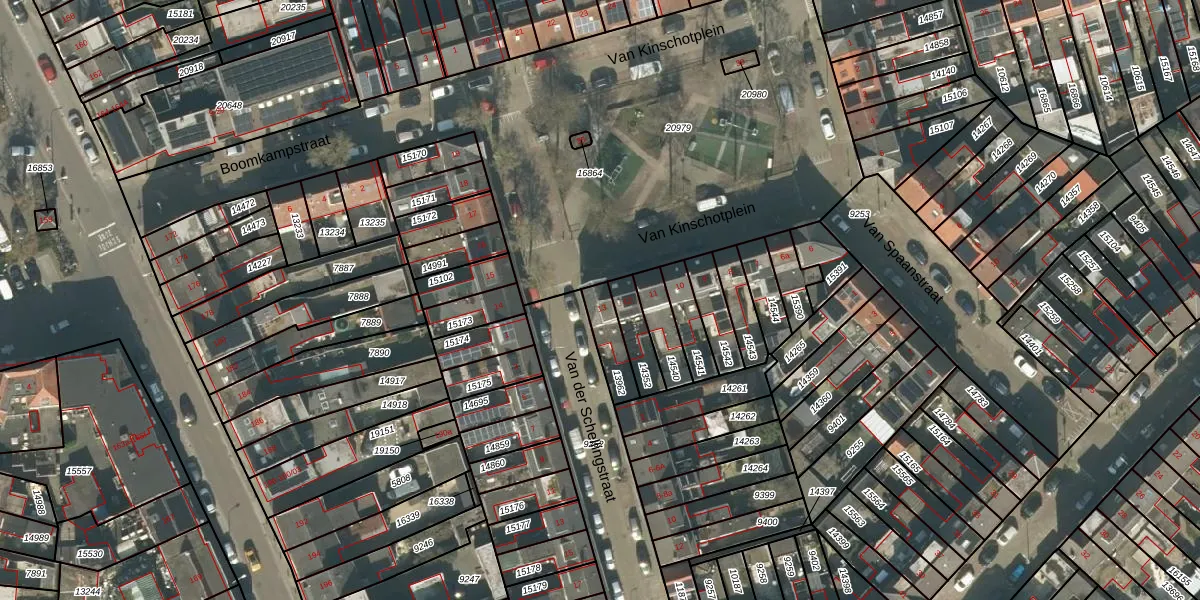 Van Kinschotplein 13 is gelegen op kadastraal perceel TBG01N13962. Deze kadastrale aanduiding is uniek en wordt gebruikt door het Kadaster om eigendomsrechten en andere zakelijke rechten vast te leggen. Het perceel maakt onderdeel uit van de kadastrale gemeente Tilburg.