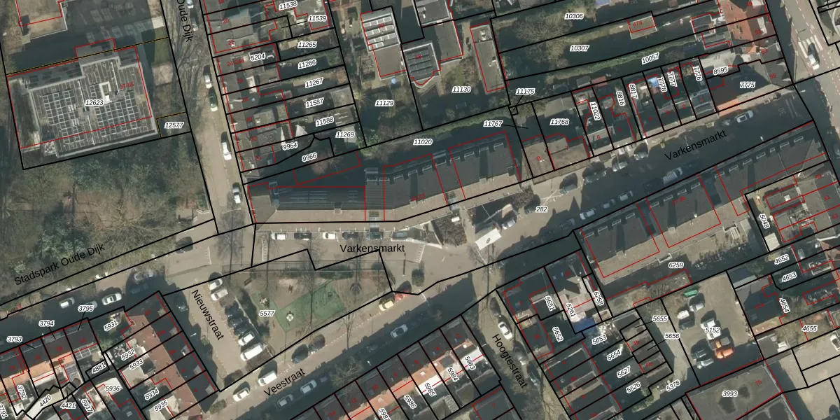 Het perceel waarop Varkensmarkt 17 staat heeft een oppervlakte van 1117 m². Dit is een zeer groot perceel. De perceeloppervlakte wordt geregistreerd door het Kadaster. Gedetailleerde informatie over de maten van dit perceel kunt u vinden in het rapport Kadastrale kaart met maatvoering van Varkensmarkt 17.