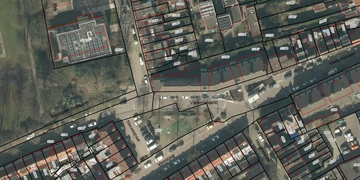 Het perceel waarop Varkensmarkt 21 staat heeft een oppervlakte van 1117 m². Dit is een zeer groot perceel. De perceeloppervlakte wordt geregistreerd door het Kadaster. Gedetailleerde informatie over de maten van dit perceel kunt u vinden in het rapport Kadastrale kaart met maatvoering van Varkensmarkt 21.