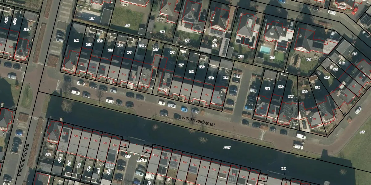 Het perceel waarop Varsseveldstraat 103 staat heeft een oppervlakte van 162 m². Dit is een middelgroot perceel. De perceeloppervlakte wordt geregistreerd door het Kadaster. Gedetailleerde informatie over de maten van dit perceel kunt u vinden in het rapport Kadastrale kaart met maatvoering van Varsseveldstraat 103.