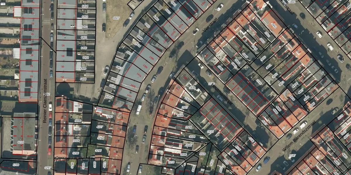 Het perceel waarop Veestraat 108 staat heeft een oppervlakte van 108 m². Dit is een middelgroot perceel. De perceeloppervlakte wordt geregistreerd door het Kadaster. Gedetailleerde informatie over de maten van dit perceel kunt u vinden in het rapport Kadastrale kaart met maatvoering van Veestraat 108.