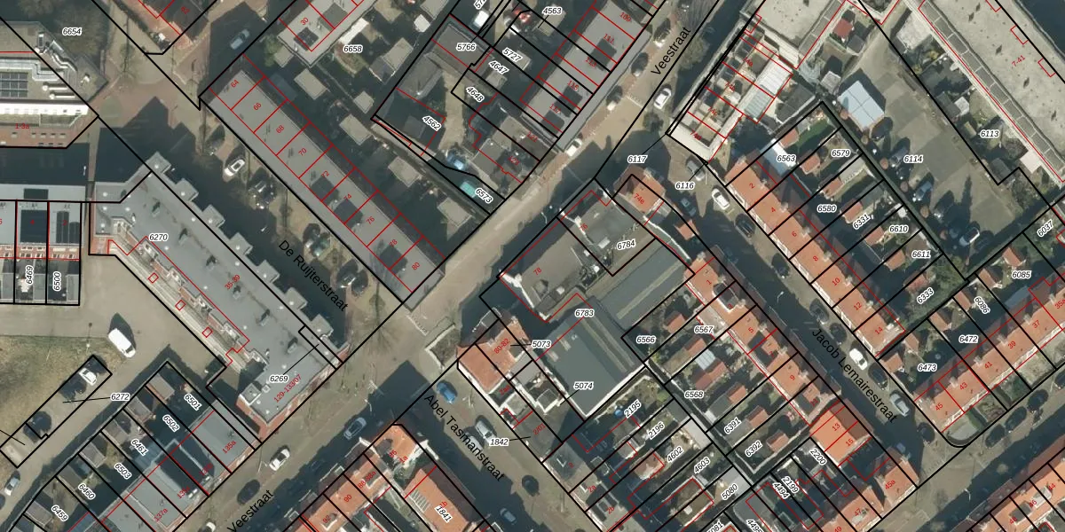 Het perceel waarop Veestraat 78 staat heeft een oppervlakte van 755 m². Dit is een groot perceel. De perceeloppervlakte wordt geregistreerd door het Kadaster. Gedetailleerde informatie over de maten van dit perceel kunt u vinden in het rapport Kadastrale kaart met maatvoering van Veestraat 78.