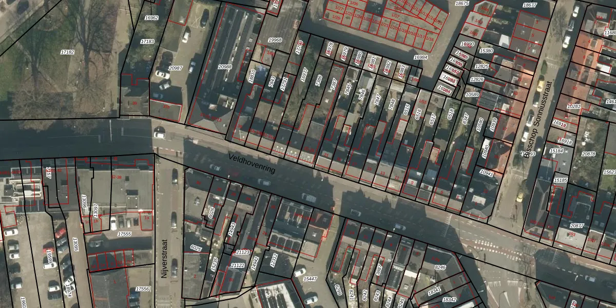 Veldhovenring 23 is gelegen op kadastraal perceel TBG01N7387. Deze kadastrale aanduiding is uniek en wordt gebruikt door het Kadaster om eigendomsrechten en andere zakelijke rechten vast te leggen. Het perceel maakt onderdeel uit van de kadastrale gemeente Tilburg.