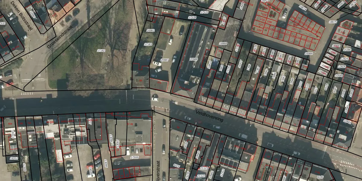 Veldhovenring 37-01 is gelegen op kadastraal perceel TBG01N20988. Deze kadastrale aanduiding is uniek en wordt gebruikt door het Kadaster om eigendomsrechten en andere zakelijke rechten vast te leggen. Het perceel maakt onderdeel uit van de kadastrale gemeente Tilburg.