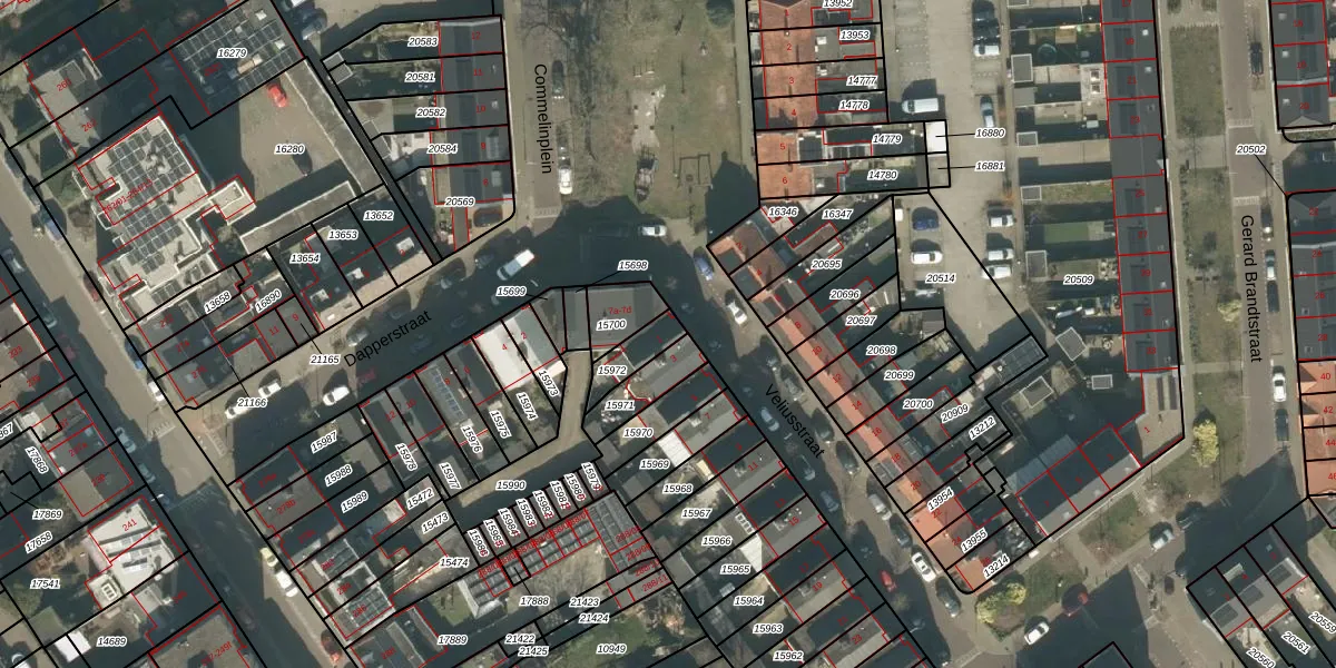 Het perceel waarop Veliusstraat 1 staat heeft een oppervlakte van 82 m². Dit is een klein perceel. De perceeloppervlakte wordt geregistreerd door het Kadaster. Gedetailleerde informatie over de maten van dit perceel kunt u vinden in het rapport Kadastrale kaart met maatvoering van Veliusstraat 1.