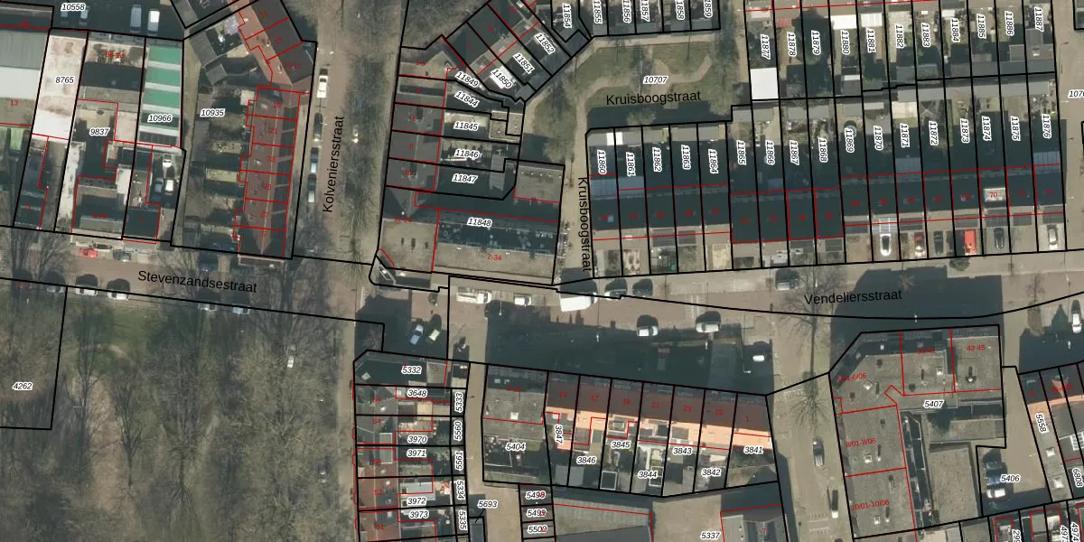 Vendeliersstraat 34 is gelegen op kadastraal perceel TBG01M11848. Deze kadastrale aanduiding is uniek en wordt gebruikt door het Kadaster om eigendomsrechten en andere zakelijke rechten vast te leggen. Het perceel maakt onderdeel uit van de kadastrale gemeente Tilburg.
