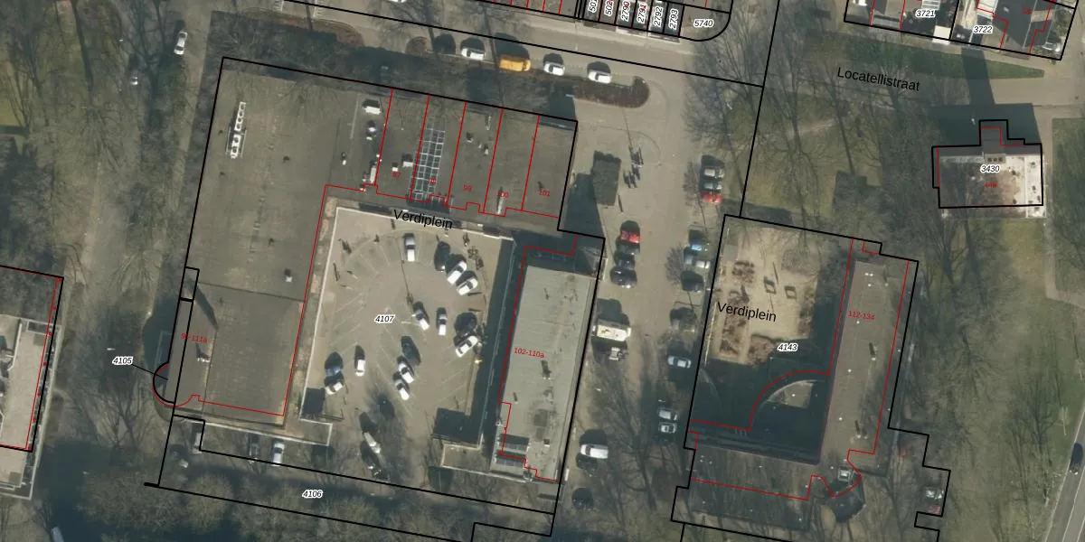 Het perceel waarop Verdiplein 102 staat heeft een oppervlakte van 5147 m². Dit is een zeer groot perceel. De perceeloppervlakte wordt geregistreerd door het Kadaster. Gedetailleerde informatie over de maten van dit perceel kunt u vinden in het rapport Kadastrale kaart met maatvoering van Verdiplein 102.
