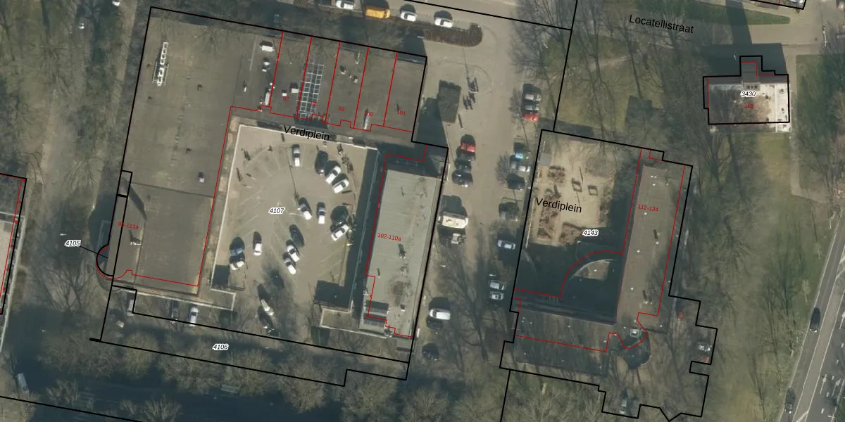 Het perceel waarop Verdiplein 107 staat heeft een oppervlakte van 5147 m². Dit is een zeer groot perceel. De perceeloppervlakte wordt geregistreerd door het Kadaster. Gedetailleerde informatie over de maten van dit perceel kunt u vinden in het rapport Kadastrale kaart met maatvoering van Verdiplein 107.