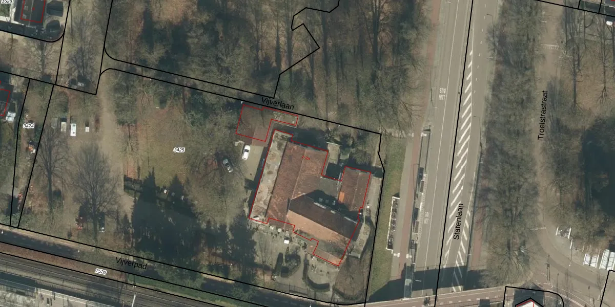 Het perceel waarop Vijverlaan 2 staat heeft een oppervlakte van 6343 m². Dit is een zeer groot perceel. De perceeloppervlakte wordt geregistreerd door het Kadaster. Gedetailleerde informatie over de maten van dit perceel kunt u vinden in het rapport Kadastrale kaart met maatvoering van Vijverlaan 2.