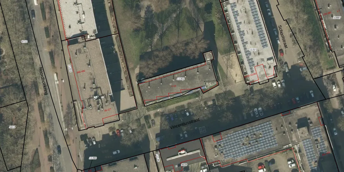 Het perceel waarop Vincentiusstraat 15 staat heeft een oppervlakte van 695 m². Dit is een groot perceel. De perceeloppervlakte wordt geregistreerd door het Kadaster. Gedetailleerde informatie over de maten van dit perceel kunt u vinden in het rapport Kadastrale kaart met maatvoering van Vincentiusstraat 15.