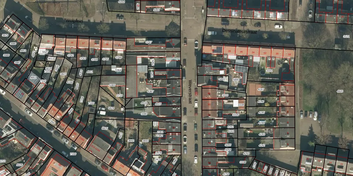 Het perceel waarop Weverstraat 45 staat heeft een oppervlakte van 430 m². Dit is een groot perceel. De perceeloppervlakte wordt geregistreerd door het Kadaster. Gedetailleerde informatie over de maten van dit perceel kunt u vinden in het rapport Kadastrale kaart met maatvoering van Weverstraat 45.