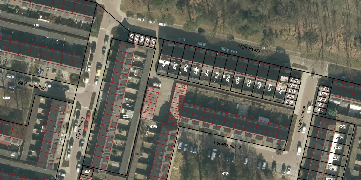 Het perceel waarop Wijnruitweg 36-h staat heeft een oppervlakte van 3989 m². Dit is een zeer groot perceel. De perceeloppervlakte wordt geregistreerd door het Kadaster. Gedetailleerde informatie over de maten van dit perceel kunt u vinden in het rapport Kadastrale kaart met maatvoering van Wijnruitweg 36-h.