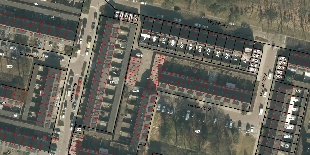 Wijnruitweg 36-l is gelegen op kadastraal perceel TBG01AD2093. Deze kadastrale aanduiding is uniek en wordt gebruikt door het Kadaster om eigendomsrechten en andere zakelijke rechten vast te leggen. Het perceel maakt onderdeel uit van de kadastrale gemeente Tilburg.