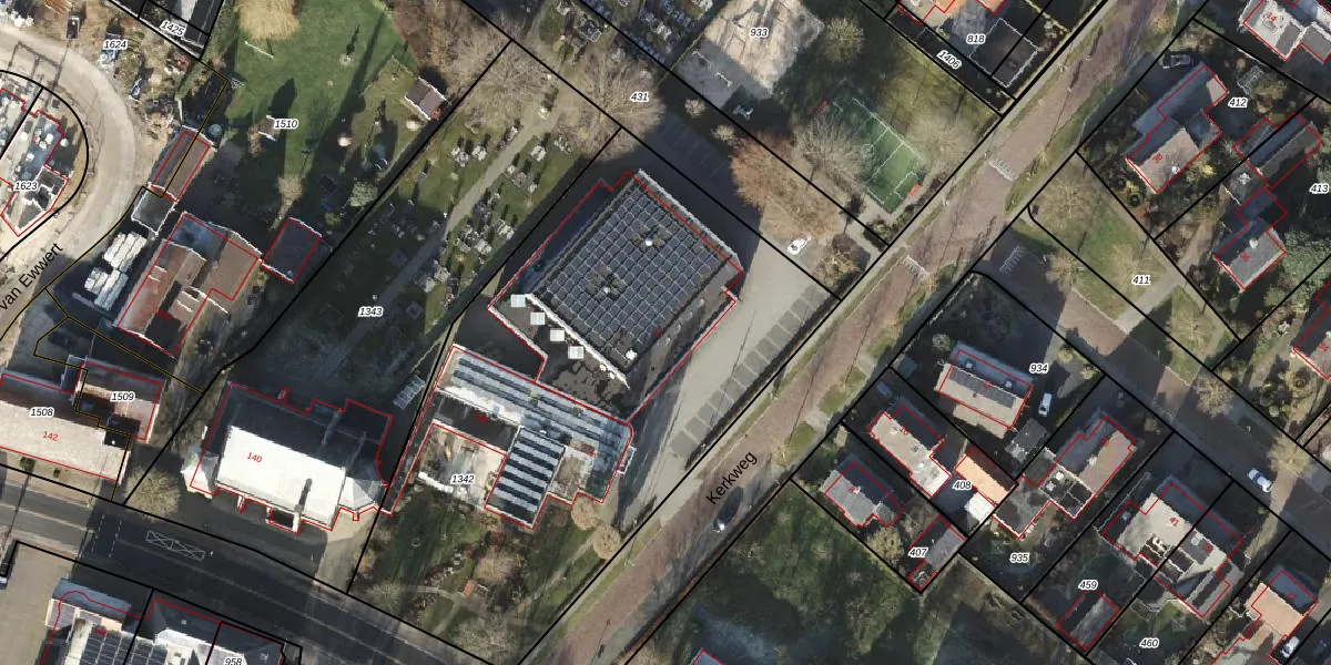 Het perceel waarop Kerkweg 5 staat heeft een oppervlakte van 2975 m². Dit is een zeer groot perceel. De perceeloppervlakte wordt geregistreerd door het Kadaster. Gedetailleerde informatie over de maten van dit perceel kunt u vinden in het rapport Kadastrale kaart met maatvoering van Kerkweg 5.