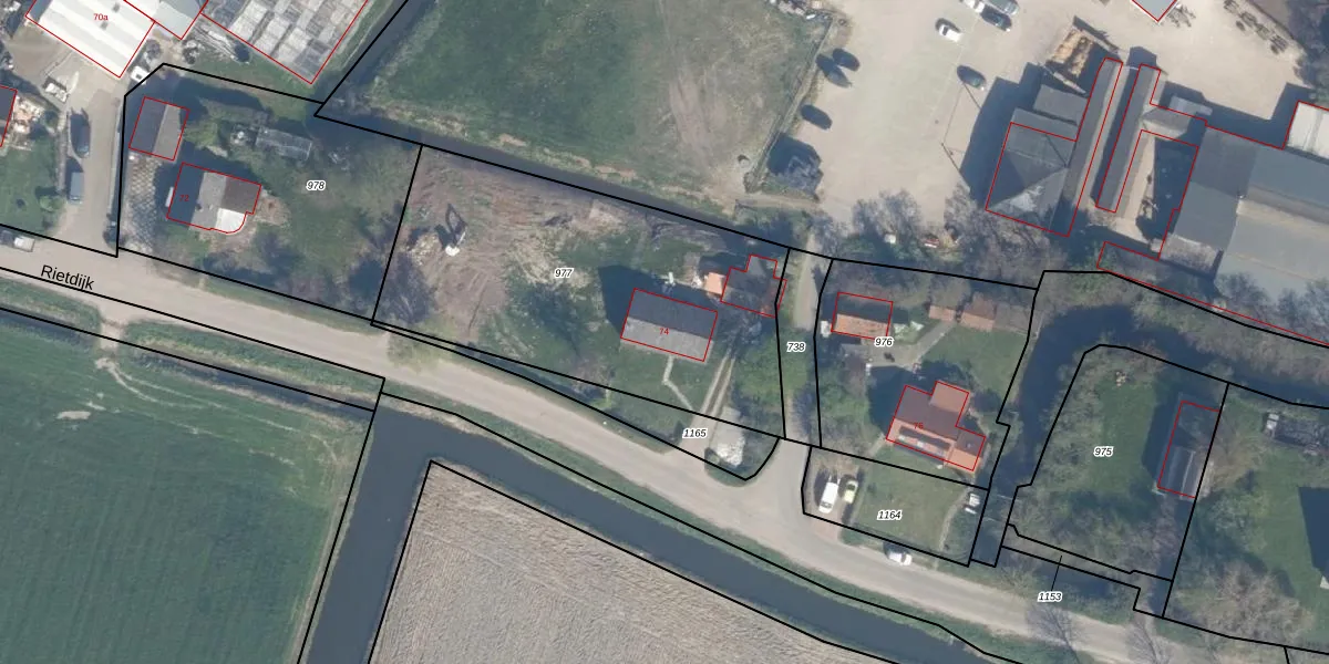 Het perceel waarop Rietdijk 74 staat heeft een oppervlakte van 1645 m². Dit is een zeer groot perceel. De perceeloppervlakte wordt geregistreerd door het Kadaster. Gedetailleerde informatie over de maten van dit perceel kunt u vinden in het rapport Kadastrale kaart met maatvoering van Rietdijk 74.