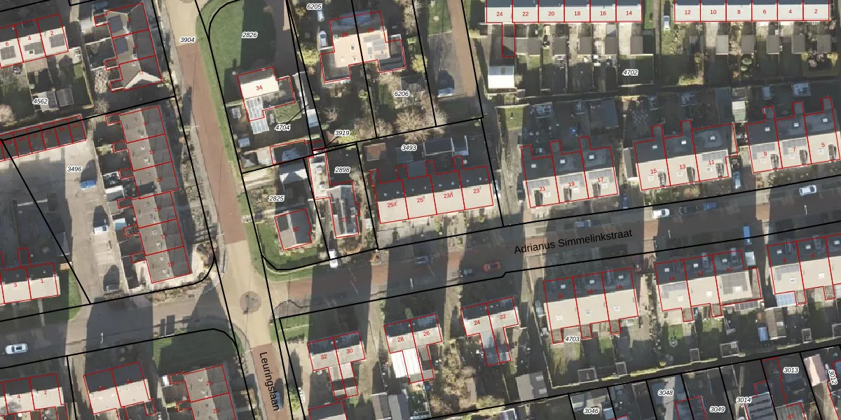 Adrianus Simmelinkstraat 25 is gelegen op kadastraal perceel LEE01H3493. Deze kadastrale aanduiding is uniek en wordt gebruikt door het Kadaster om eigendomsrechten en andere zakelijke rechten vast te leggen. Het perceel maakt onderdeel uit van de kadastrale gemeente Leek.