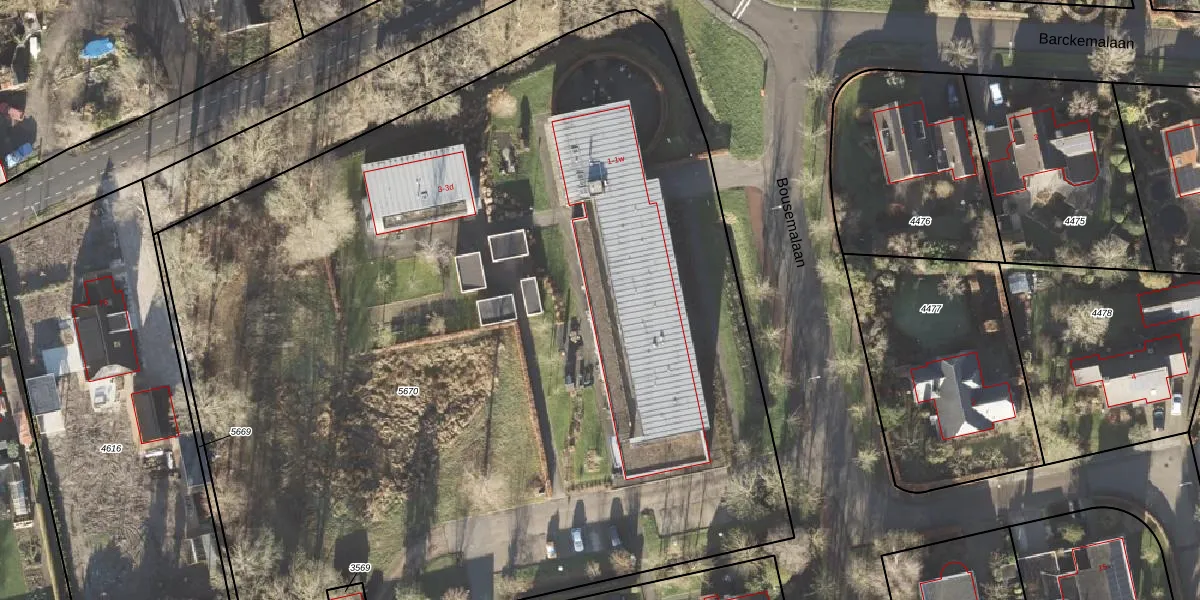 Het perceel waarop Bousemalaan 1-c staat heeft een oppervlakte van 7635 m². Dit is een zeer groot perceel. De perceeloppervlakte wordt geregistreerd door het Kadaster. Gedetailleerde informatie over de maten van dit perceel kunt u vinden in het rapport Kadastrale kaart met maatvoering van Bousemalaan 1-c.