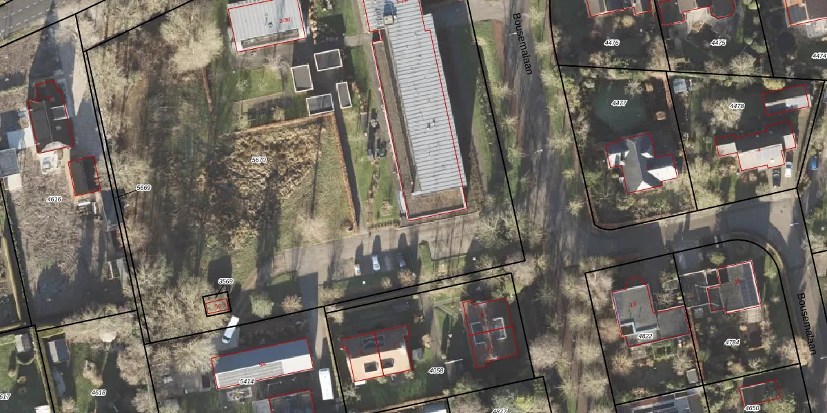 Het perceel waarop Bousemalaan 1-k staat heeft een oppervlakte van 7635 m². Dit is een zeer groot perceel. De perceeloppervlakte wordt geregistreerd door het Kadaster. Gedetailleerde informatie over de maten van dit perceel kunt u vinden in het rapport Kadastrale kaart met maatvoering van Bousemalaan 1-k.