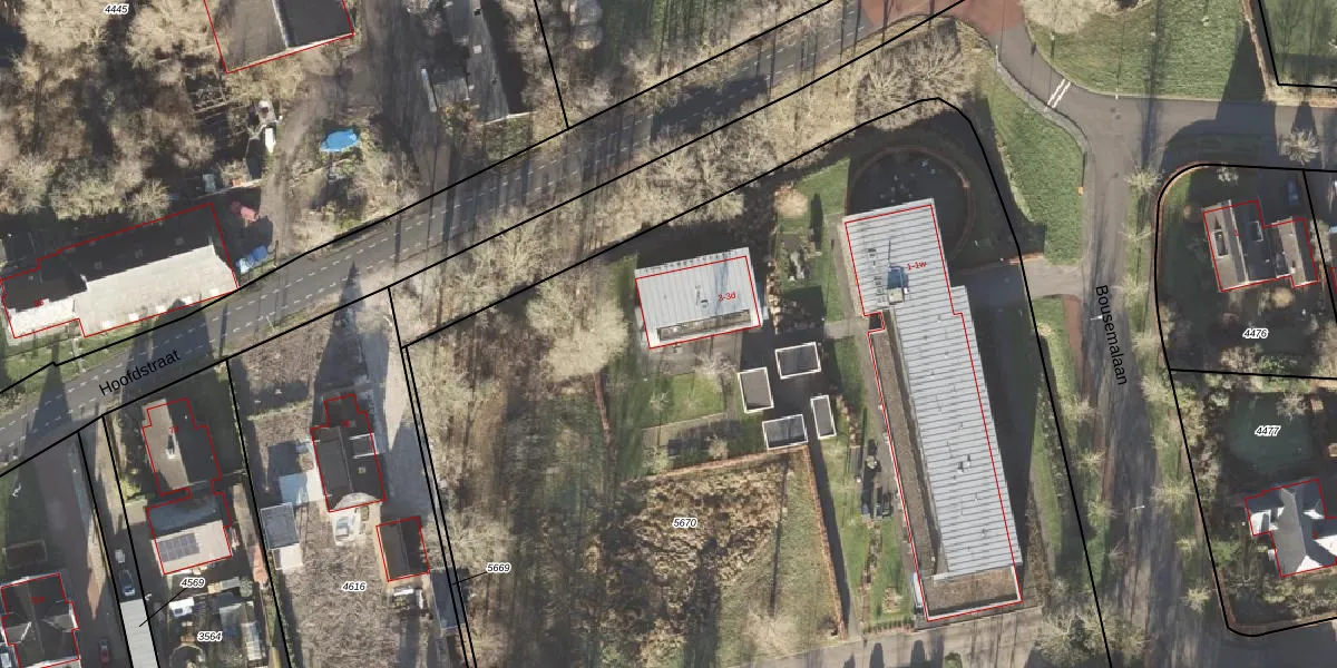 Het perceel waarop Bousemalaan 3-b staat heeft een oppervlakte van 7635 m². Dit is een zeer groot perceel. De perceeloppervlakte wordt geregistreerd door het Kadaster. Gedetailleerde informatie over de maten van dit perceel kunt u vinden in het rapport Kadastrale kaart met maatvoering van Bousemalaan 3-b.