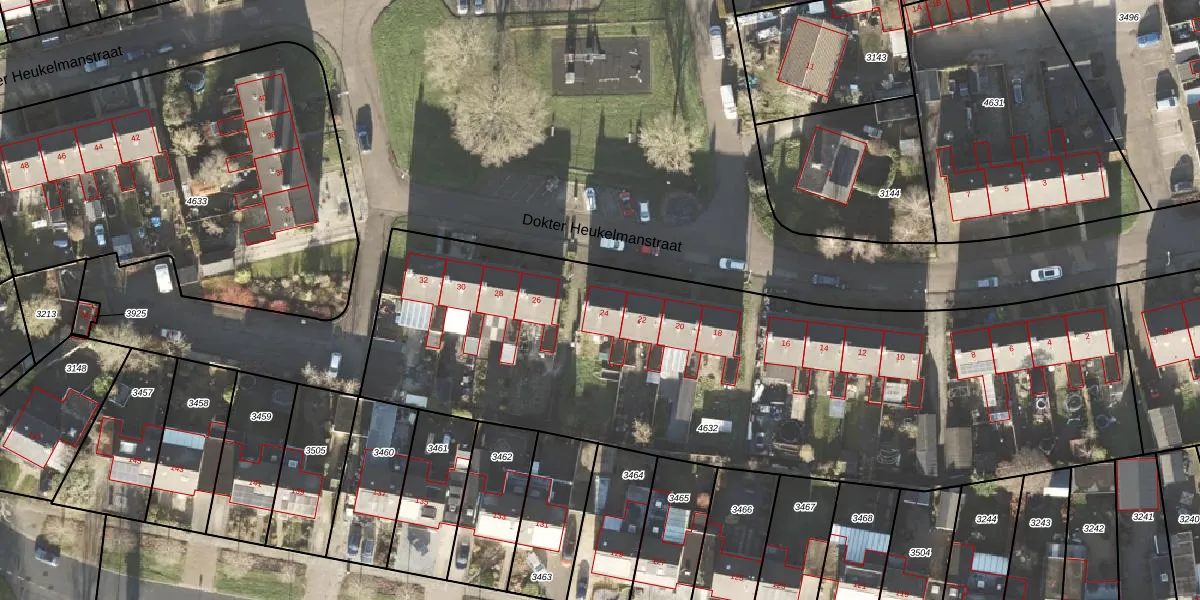 Het perceel waarop Dokter Heukelmanstraat 24 staat heeft een oppervlakte van 3702 m². Dit is een zeer groot perceel. De perceeloppervlakte wordt geregistreerd door het Kadaster. Gedetailleerde informatie over de maten van dit perceel kunt u vinden in het rapport Kadastrale kaart met maatvoering van Dokter Heukelmanstraat 24.