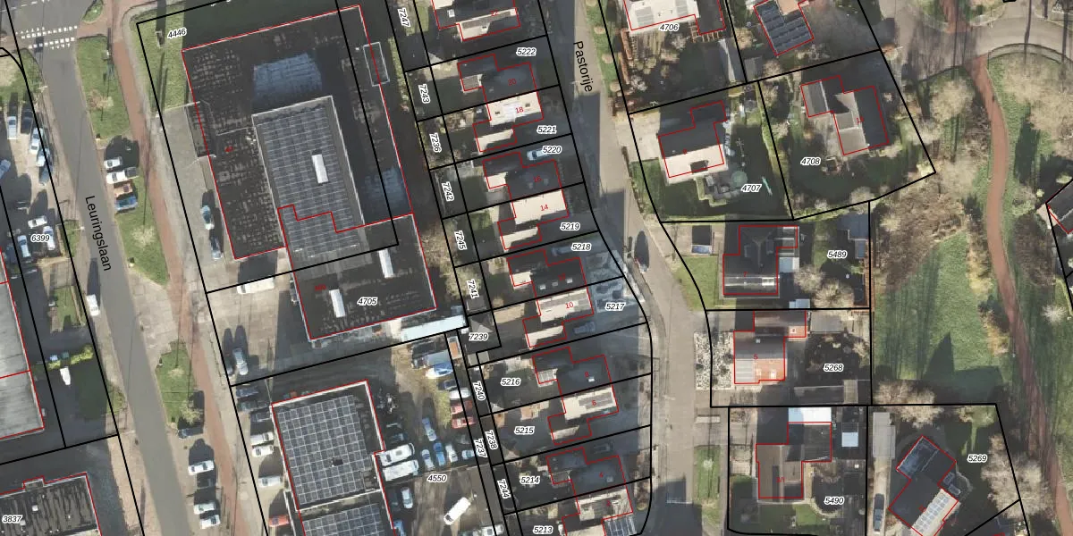 Pastorije 12 is gelegen op kadastraal perceel LEE01H5218. Deze kadastrale aanduiding is uniek en wordt gebruikt door het Kadaster om eigendomsrechten en andere zakelijke rechten vast te leggen. Het perceel maakt onderdeel uit van de kadastrale gemeente Leek.