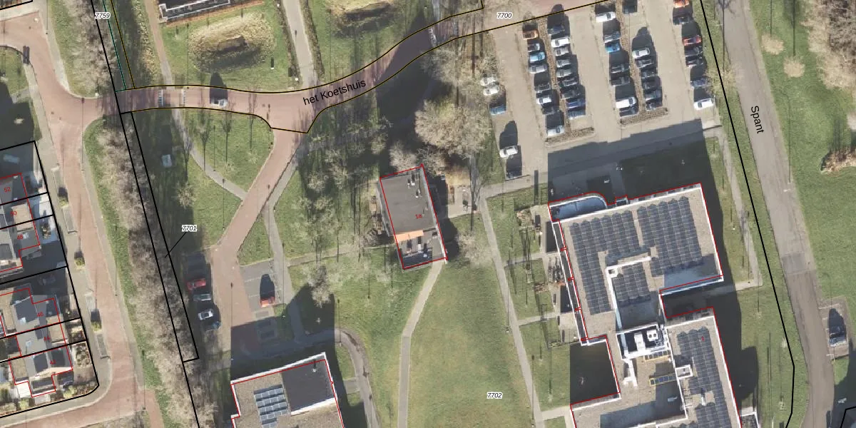 Het perceel waarop Spant 1-a staat heeft een oppervlakte van 2,2 ha. Dit is een zeer groot perceel. De perceeloppervlakte wordt geregistreerd door het Kadaster. Gedetailleerde informatie over de maten van dit perceel kunt u vinden in het rapport Kadastrale kaart met maatvoering van Spant 1-a.