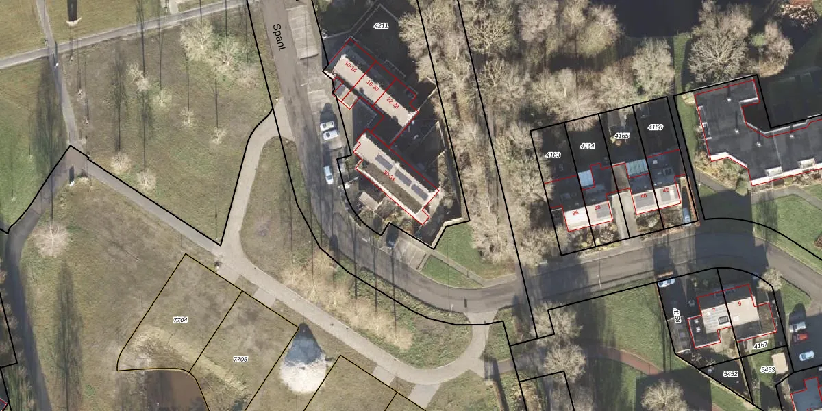Het perceel waarop Spant 34 staat heeft een oppervlakte van 2115 m². Dit is een zeer groot perceel. De perceeloppervlakte wordt geregistreerd door het Kadaster. Gedetailleerde informatie over de maten van dit perceel kunt u vinden in het rapport Kadastrale kaart met maatvoering van Spant 34.