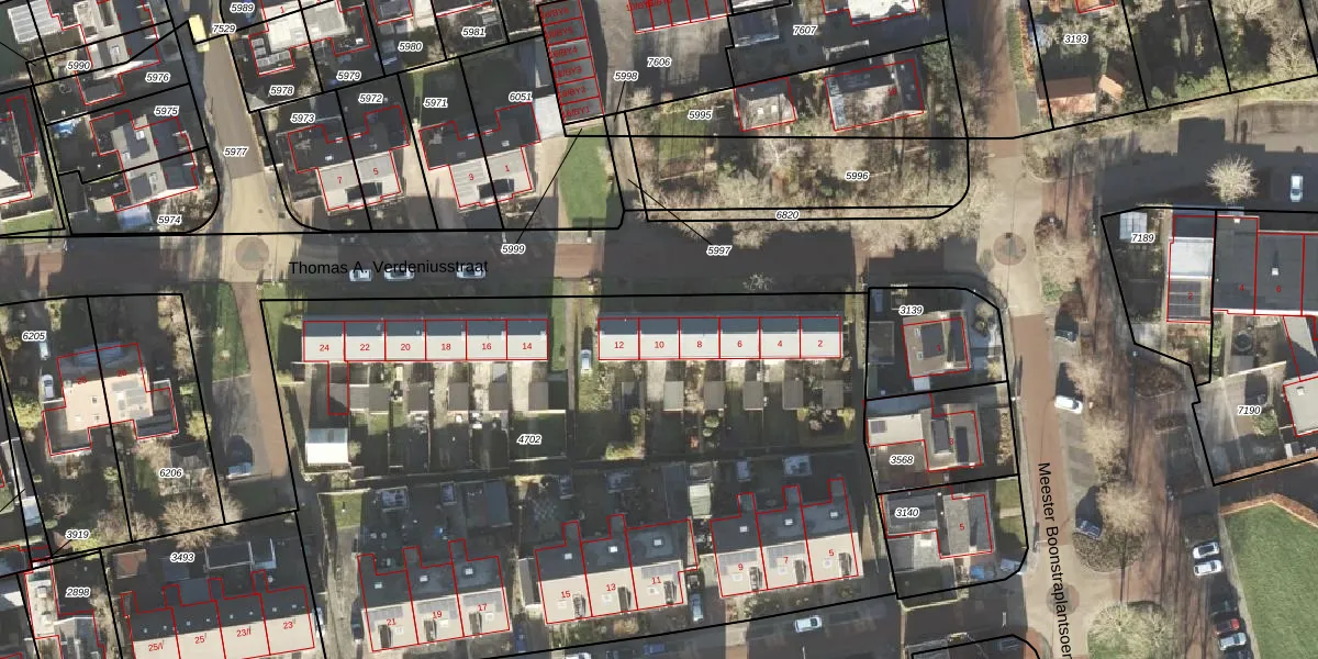 Het perceel waarop Thomas A. Verdeniusstraat 10 staat heeft een oppervlakte van 4640 m². Dit is een zeer groot perceel. De perceeloppervlakte wordt geregistreerd door het Kadaster. Gedetailleerde informatie over de maten van dit perceel kunt u vinden in het rapport Kadastrale kaart met maatvoering van Thomas A. Verdeniusstraat 10.