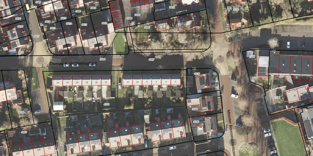 Thomas A. Verdeniusstraat 6 is gelegen op kadastraal perceel LEE01H4702. Deze kadastrale aanduiding is uniek en wordt gebruikt door het Kadaster om eigendomsrechten en andere zakelijke rechten vast te leggen. Het perceel maakt onderdeel uit van de kadastrale gemeente Leek.