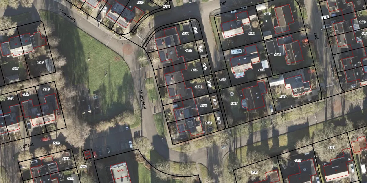 Veenderij 7 is gelegen op kadastraal perceel LEE01H4434. Deze kadastrale aanduiding is uniek en wordt gebruikt door het Kadaster om eigendomsrechten en andere zakelijke rechten vast te leggen. Het perceel maakt onderdeel uit van de kadastrale gemeente Leek.
